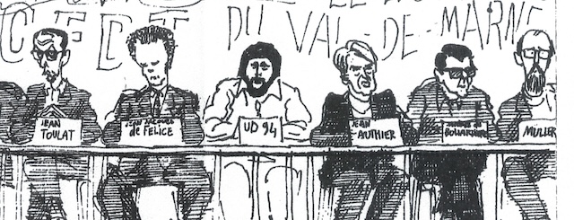 C’est en 1972 que l’affaire du Larzac prend son essor et que des ouvrages sur la non-violence de J.-M. Muller et Jean Toulat sont des succès de li- braire. Jean, que l’on peut qualifier de véritable anarchiste non-violent, rêve alors de rapprocher les pacifistes des non-violents. Il publie Les Travailleurs face à l’armée, avec une postface de B. Clavel. Jean mise sur la CFDT dont il est membre pour relayer les idées de reconversion des usines d’armement et surtout la lutte contre la Bombe et celle contre la militarisation de la société. Jean anime des meetings, se décarcasse. Le jeune Cabu aime à le suivre et le croque maintes fois.